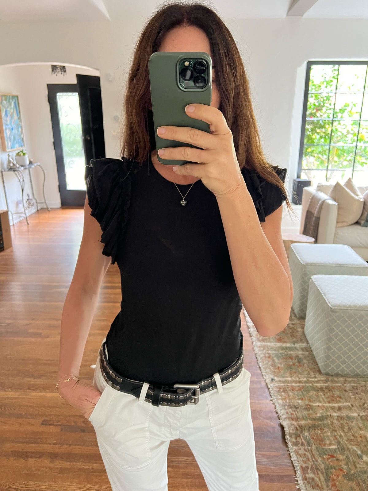 I love the Celeste Ruffle Sleeve Tee. Of course, it’s super comfortable and has just the right amount of detail in the sleeves and is perfectly tailored to skim the body. It’s versatile and looks great with both hi-waisted jeans or my drop-waist carpenter jeans too.
