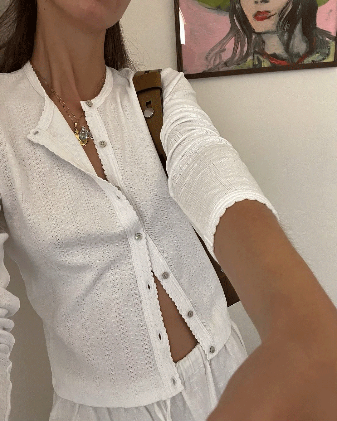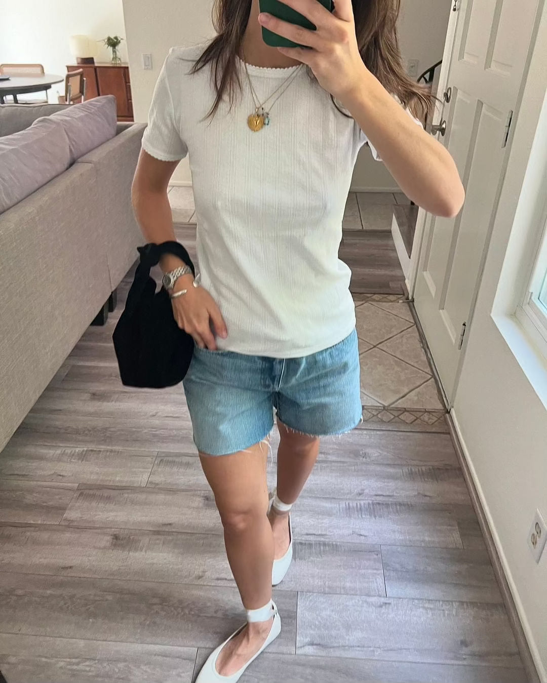 My favorite tee is the Goldie Organic Love Tee. There's just something about its lightweight, breathable fabric that makes it stand out. It might sound silly to make such a big deal out of a simple t-shirt, but they really can make or break an outfit, in my opinion. Besides being extremely light, it has the perfect length—long enough to tuck in if needed, but not too short. Plus, the sleeves are slightly longer than any other white tee in my closet, which ultimately made me choose this one. I've been wearing it over a satin short skirt lately or with blue jeans and black loafers, and I’m loving it.