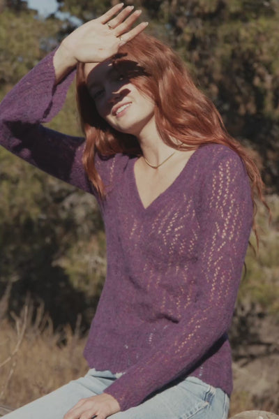 Something special: a multi-tonal, heathered pointelle sweater with bell sleeves, a deep V-neck and scalloped trim—crafted with love in Peru.