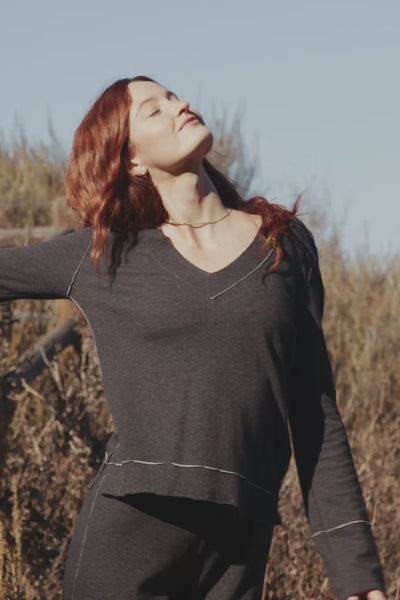 So perfect: a gloriously soft pullover with a deep V-neck, contrasting seams and elongated, bell-shaped cuffs. Unfinished hems create a modern, lived-in look.